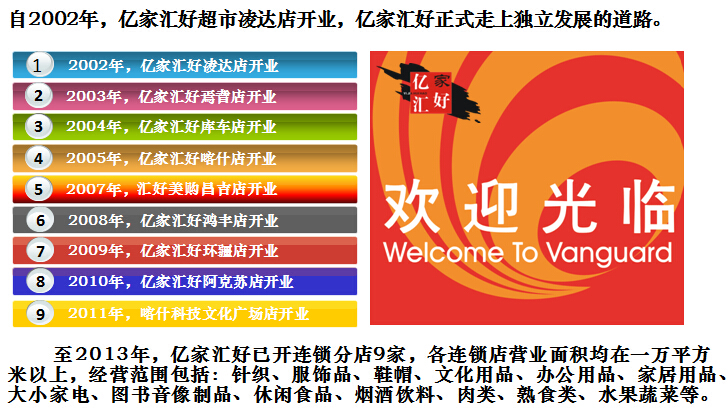 億家匯好商貿(mào)有限責(zé)任公司于2002年成立,并從臺灣引進(jìn)連鎖經(jīng)營職業(yè)管理團(tuán)隊(duì),統(tǒng)一管理旗下各地的連鎖超市。公司通過多年的穩(wěn)健發(fā)展,至2013年底,億家匯好商貿(mào)有限責(zé)任公司已成為擁有員工近3000多人,下轄一個配送中心和9家連鎖超市的大型綜合性零售企業(yè)??偨?jīng)營面積11萬多平方米,配送中心輻射公司所有超市,年配送額可達(dá)2億元。公司大量吸納下崗職工,經(jīng)過崗前培訓(xùn),提高勞動技能,實(shí)現(xiàn)了他們的再就業(yè),為維護(hù)社會和諧穩(wěn)定做出了貢獻(xiàn)。2013年,巴州億家匯好商貿(mào)有限責(zé)任公司在自治區(qū)零售業(yè)中穩(wěn)踞前三位,是自治區(qū)重要的流通龍頭企業(yè),2013年年銷售收入達(dá)10億人民幣。多年來,公司一直重管理、抓實(shí)效、運(yùn)用先進(jìn)的管理手段和營銷理念,秉承億家匯好人 時時尋求效率創(chuàng)新,事事講究專業(yè)技術(shù)的文化精髓,創(chuàng)造了良好的經(jīng)濟(jì)效益和社會效益。公司先后多次被消費(fèi)者協(xié)會評為誠信單位,并多年被評為重合同,守信用單位。